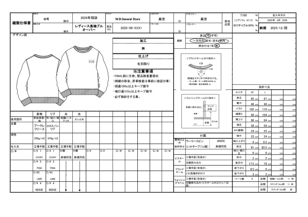 全国展開する(仮想)総合雑貨店の初売り用レディースルームウェア福袋の縫製指図書です。