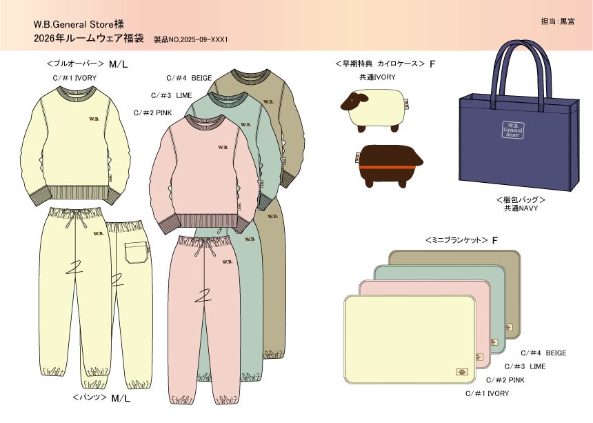 全国展開する(仮想)総合雑貨店の初売り用レディースルームウェア福袋の縫製指図書です。